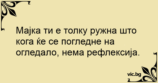 Мајка ти е толку ружна што кога ќе се погледне на огледало, нема рефлексија.