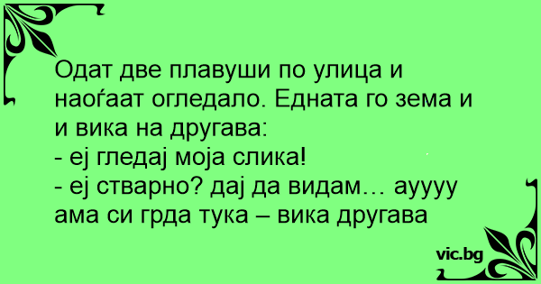 Одат две плавуши по улица и наоѓаат огледало. Едната го зема и и вика на другава: