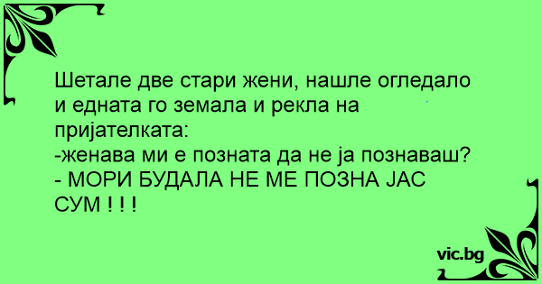 Шетале две стари жени, нашле огледало и едната го земала и рекла на пријателката: