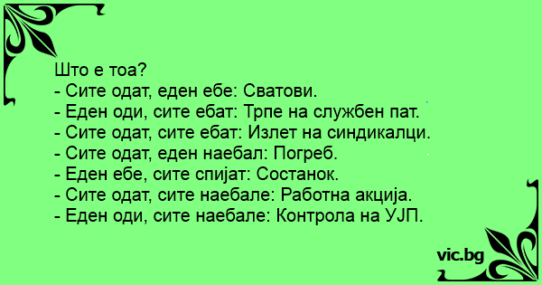 - Сите одат, еден eбe: Сватови.
