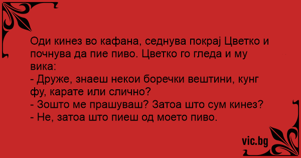 Вчера в мой любимый бар зашел китаец. Я спросил, знает ли он кунг-фу или какие нибудь боевые искуства.