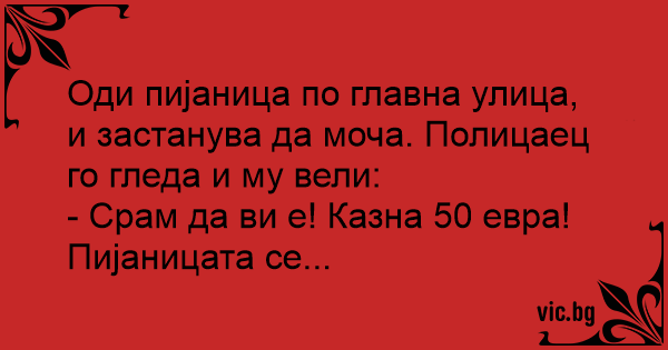 Оди пијаница по главна улица, и застанува да моча. Полицаец го гледа и му вели: