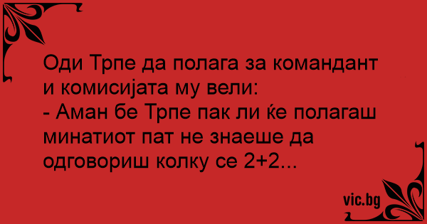 - Аман бе Трпе пак ли ќе полагаш минатиот пат не знаеше да одговориш колку се 2+2...
