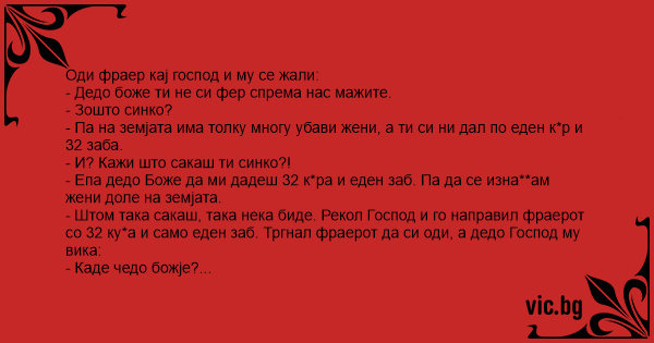 - Штом така сакаш, така нека биде. Рекол Господ и го направил фраерот со 32 kуpa и само еден заб. Тргнал фраерот да си оди, а дедо Господ му вика:
