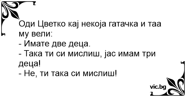 Гатање Един мъж отишъл на врачка. Мъж отива при гадателка и тя му казва: Един мъж отива при врачка, а тя му казва: Прогуливаясь по ярмарочной площади, мужчина видит палатку предсказателя судьбы. Решив, что это будет забавно, он входит в палатку. Kommt ein Mann zur Wahrsagerin und setzt sich vor die Kristallkugel. „Wie ich sehe, sind Sie Vater von zwei Kindern“, sagt die Wahrsagerin. „Das glauben SIE!“, erwidert er. „Ich bin Vater von drei Kindern.“ Die Wahrsagerin lächelt und antwortet: „Das glauben SIE!“ En man som är på ett tivoli bestämmer sig för att gå till en spådam för skojs skull. - Jag ser att du är far till två barn, säger spådamen. - HA. Det är vad du tror, säger mannen skadeglatt. Jag är far till tre barn. - HA, säger spådamen. Det är... O sujeito vai à cartomante. Ela olha atentamente a bola de cristal e fala: — Vejo que o senhor tem dois filhos. — A senhora está enganada. Eu tenho quatro filhos. — Isso é o que o senhor pensa. Een man loopt op de kermis en ziet de tent van een waarzegster. Dat wordt lachen, denkt hij, en gaat naar binnen. "Ik zie dat je de vader van twee kinderen bent," zegt de waarzegster, terwijl ze in... A man was wandering around a carnival and he happened to see a fortuneteller’s tent. Thinking it would be good for a laugh, he went inside and sat down. “Ah…” said the woman as she gazed into her... Jussi meni tapaamaan ennustajaeukkoa. Eukko mulkaisi miestä ja totesi tämän olevan naimisissa. - Joo, sanoi Jussi. - Ja teillä on hyvin kaunis nuori vaimo, eukko jatkoi. - Joo sanoi Jussi. -... Igen, igen, látom. Ön 2 gyönyörű gyermek édesapja - mondja a jósnő. - Nem kérem, nekem 3 gyerekem van. - Azt maga csak hiszi! En mand opsøgte en spåkone og satte sig ned foran krystalkuglen. "Jeg kan se, at du er far til to børn.", sagde spåkonen. "Det er noget, du tror.", svarede manden, "Jeg er nemlig far til tre børn."... Un caballero va a visitar a una adivina, toma asiento ante la mesa donde está la bola de cristal y ella le dice: - Veo que usted tiene dos hijos. - Pues eso es lo que usted cree. Tengo tres hijos.... Un tânăr se duce la o ghicitoare, se aşează la masa pe care este un bol de cristal şi ea îi spune: - Văd că dumneata ai doi copii. - Asta s-o crezi matale. Am trei copii! Ghicitoarea zâmbeşte şi-i... Jasnowidz mówi do mężczyzny: - Jest pan ojcem dwójki dzieci. - Tak pan myśli? - zaśmiał się mężczyzna i sprostował: - Ja jestem ojcem trójki dzieci. - To pan tak myśli? - zaśmiał się jasnowidz.