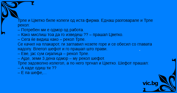 Трпе и Цветко биле колеги од иста фирма. Еднаш разговарале и Трпе рекол: