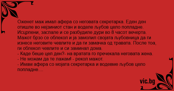 Оженет маж имал афера со неговата секретарка. Еден ден отишле во нејзиниот стан и воделе љубов цело попладне. Исцрпени, заспале и се разбудиле дури во 8 часот вечерта.