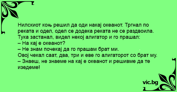 Нилскиот коњ решил да оди накај океанот. Тргнал по реката и одел, одел се додека реката не се раздвоила. Тука застанал, видел некој алигатор и го прашал: