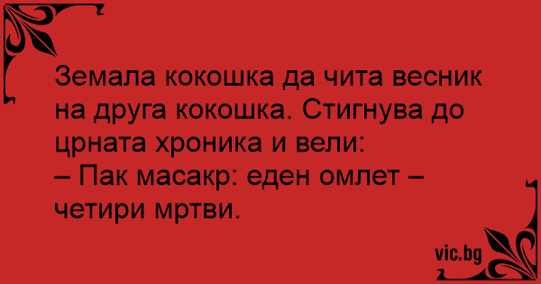 Земала кокошка да чита весник на друга кокошка. Стигнува до црната хроника и вели: