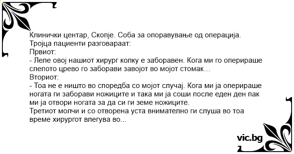 - Леле овој нашиот хирург колку е заборавен. Кога ми го оперираше слепото црево го заборави завојот во мојот стомак…