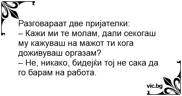 – Кажи ми те молам, дали секогаш му кажуваш на мажот ти кога доживуваш оргазам?