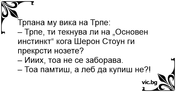 – Трпе, ти текнува ли на „Основен инстинкт“ кога Шерон Стоун ги прекрсти нозете?