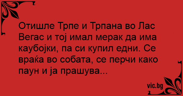 Отишле Трпе и Трпана во Лас Вегас и тој имал мерак да има каубојки, па си купил едни. Се враќа во собата, се перчи како паун и ја прашува...