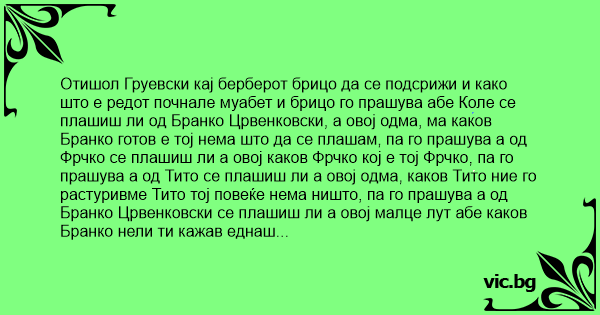 Отишол Груевски кај берберот брицо да се подсрижи и како што е редот почнале муабет и брицо го прашува абе Коле се плашиш ли од Бранко Црвенковски, а овој одма, ма каков Бранко готов е тој нема што да се плашам, па го прашува а од Фрчко се плашиш ли а овој каков Фрчко кој е тој Фрчко, па го прашува а од Тито се плашиш ли а овој одма, каков Тито ние го растуривме Тито тој повеќе нема ништо, па го прашува а од Бранко Црвенковски се плашиш ли а овој малце лут абе каков Бранко нели ти кажав еднаш нема ништо тој, брицо продолжува а Коле од Андов се плашиш ли а овој одма каков Андов тој нема веќе партија му ја растуривме од него ќе се плашам, а од Ахмети се плашиш ли овој одма, ма готов е и тој на овие избори, па го прашува а од Манасиевски се плашиш ли, а овј абе каков Манасиевски и тој нема што да бара веќе готов е, и пак брицо го прашува а од Бранко Црвенковски се плашиш ли, и Груевски веќе многу лут му вика абе два пати ти реков не се плашам и не ме прашувај веќе за него, што си запнал толку од никој не се плашам па ни од него,,, и тогаш брицо му вика абе Коле кога ке ти го спомнам Бранко само од него косата ти се крева нагоре и многу ми е полесно да те шишам, а на другиве не реагираш му рекол брицо.