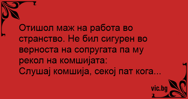 Отишол маж на работа во странство. Не бил сигурен во верноста на сопругата па му рекол на комшијата: