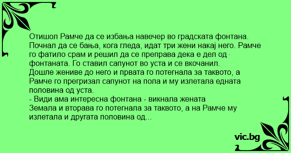 Отишол Рамче да се избања навечер во градската фонтана. Почнал да се бања, кога гледа, идат три жени накај него. Рамче го фатило срам и решил да се преправа дека е дел од фонтаната. Го ставил сапунот во уста и се вкочанил.