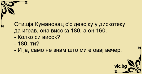 Отишја Кумановац с’с девојку у дискотеку да играв, она висока 180, а он 160.