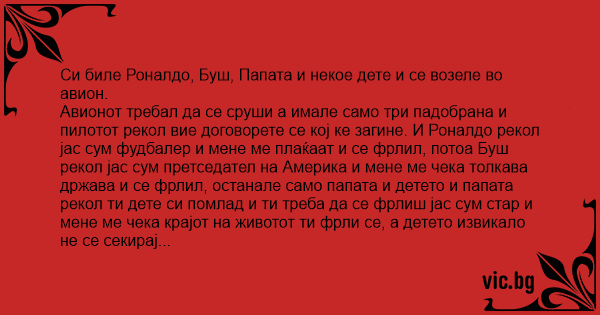 Авионот требал да се сруши а имале само три падобрана и пилотот рекол вие договорете се кој ке загине. И Роналдо рекол јас сум фудбалер и мене ме плаќаат и се фрлил, потоа Буш рекол јас сум претседател на Америка и мене ме чека толкава држава и се фрлил, останале само папата и детето и папата рекол ти дете си помлад и ти треба да се фрлиш јас сум стар и мене ме чека крајот на животот ти фрли се, а детето извикало не се секирај Папа, Буш го зема мојот ранец за во школо.
