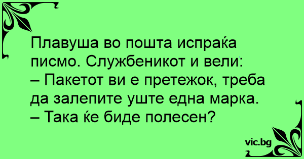 Плавуша во пошта испраќа писмо. Службеникот и вели: