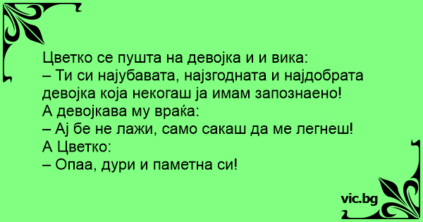 Он: Ти си најсимпатичната, и најубавата девојка што сум ја видел! Она: Ма не сери, само сакаш да ме е*еш или! Он: Ооо, па ти си била и паметна...