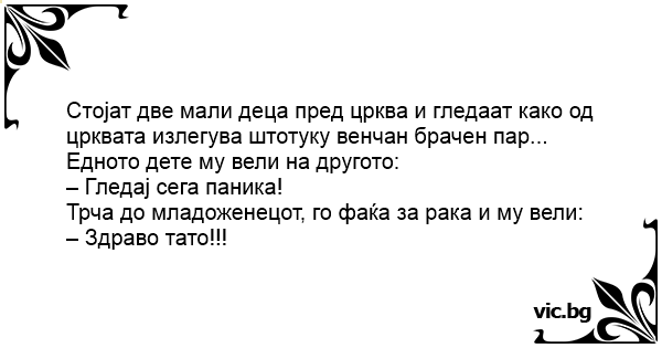 Стојат две мали деца пред црква и гледаат како од црквата излегува штотуку венчан брачен пар...