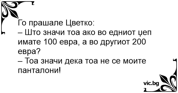 Öğretmen çocuğa sormuş; - Elini pantolonun sağ cebine attın ve bir 200 lira çıkarttın, sol cebinden de 100 lira çıktı. Senin şimdi kaç paran var? Öğretmen çocuğun 300 liram var cevabını vermesini... Opettaja yritti opettaa oppilailleen matematiikkaa. - Jos sinulla on 20€ toisessa taskussa ja toisessa 30€, mitä sinulla silloin on? Pikku-Ville vastasi: - Jonkun toisen housut. Bir gün öğretmen çocuğa sormuş: bi elini sağ cebine attın 10 lira çıktı diğer elinide sol cebşne attın 5 lira çıktı şimdi senin neyin oldu? vala öğretmenim galiba üzerimde başka birinin pantolonu var. - A ver, Jaimito, si en un bolsillo tienes 10.000 pesetas y en otro 34.000 pesetas, ¿Qué tienes en total? - Pues los pantalones de otro. - Иванчо, колко прави 10+5? - Не си спомням. - Добре, ако имаш в единия джоб 10 лв., а в другия 5 лв., значи ... - ... Значи съм обул чужди панталони ... O professor de matemática pergunta ao aluno: — Joãozinho. — Pode perguntar, professor. — Se você tivesse trinta reais num bolso e setenta no outro, o que teria? — A calça de uma outra pessoa, professor! Teacher: “If you reached in your right pocket and found a nickel, and you reached in your left pocket and found another one, what would you have?” Toto a du mal à comprendre l'arithmétique. La maîtresse essaie de lui faire comprendre grâce à des exemples: Учителка пита: - Иванчо, колко е 5+10? учительница спрашивает: - вова, если в одном кармане брюк у тебя... Το παντελόνι του Τοτού Toto a bien du mal avec les additions. La maîtresse lui demande : - Dis-moi, Toto, si tu mets une main dans ta poche droite et que tu en sors 10 €, puis tu mets l'autre main  dans ta poche gauche... Opettaja matikan tunnilla ”Jos sinulla on toisessa taskussa 5 euroa ja toisessa 10 euroa, mitä sinulla silloin on?” ”Jonkun toisen housut.” Vastasi Kalle. La maestra di matematica si rivolge a Pierino per una domanda inerente la lezione effettuata: - Ascoltami bene Pierino, se tu avessi nella tasca destra dei tuoi pantaloni 100 Euro, e in quella... Öğretmen Aliyi tahtaya kaldırır ve; - Ali bak cebinde 10 TL var bende sana 15 TL verdim. Cebinde ne kadar var. - Cebimde ne var bilmem ama galiba üstümde başkasının pantolonu var.