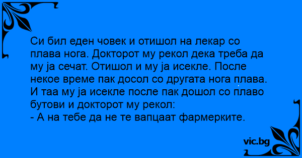 Си бил еден човек и отишол на лекар со плава нога. Докторот му рекол дека треба да му ја сечат. Отишол и му ја исекле. После некое време пак досол со другата нога плава. И таа му ја исекле после пак дошол со плаво бутови и докторот му рекол: