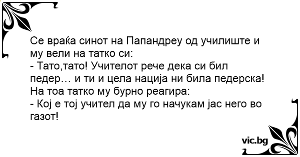 - Тато,тато! Учителот рече дека си бил педер… и ти и цела нација ни била педерска!