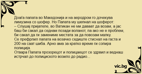 – Слушај пријателе, во Ватикан не ми даваат да возам, а јас баш би сакал да седнам позади воланот, па ако не е проблем, би сакал да ги замениме местата за да повозам малку.