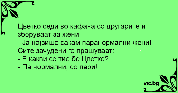 - Минчо, ти каква жена би желал да имаш? - Паранормална! - Как така? - Ами да има пари и да е нормална.