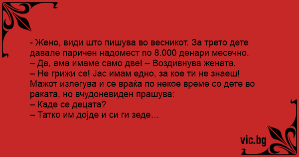 – Жено, виж какво пише във вестника. Който има 3 деца му дават 3000 евро и къща.