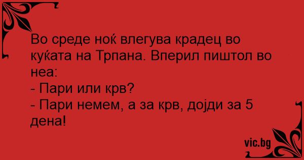 Вo среде ноќ влегува крадец во куќата на Трпана. Вперил пиштол во неа: