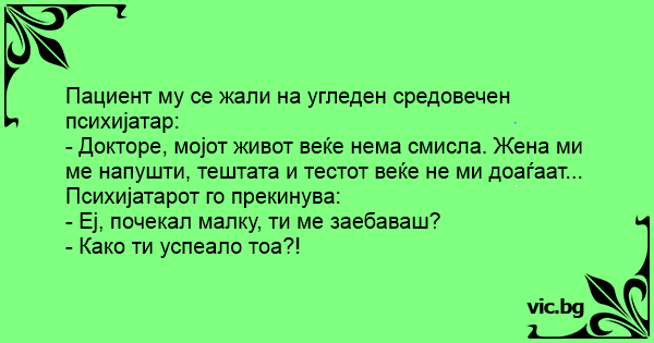 - Докторе, мојот живот веќе нема смисла. Жена ми ме напушти, тештата и тестот веќе не ми доаѓаат...