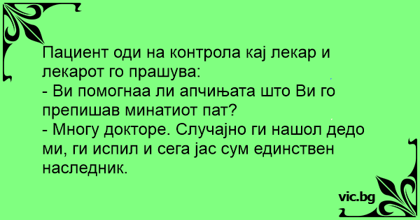 Пациент оди на контрола кај лекар и лекарот го прашува: