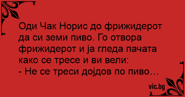 Оди Чак Норис до фрижидерот да си земи пиво. Го отвора фрижидерот и ја гледа пачата како се тресе и ви вели: