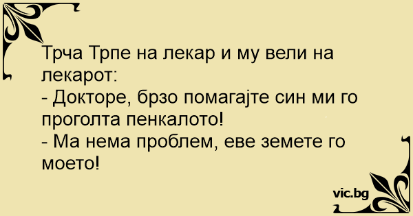 - Докторе, брзо помагајте син ми го проголта пенкалото!