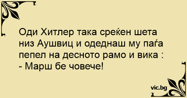 Oди Хитлер така среќен шета низ Аушвиц и одеднаш му паѓа пепел на десното рамо и вика :