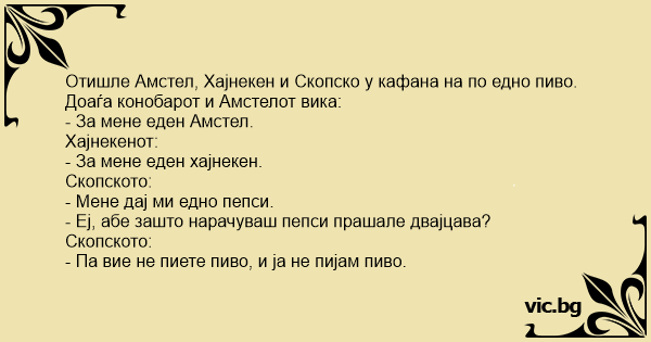 Отишле Амстел, Хајнекен и Скопско у кафана на по едно пиво. Доаѓа конобарот и Амстелот вика: - За мене еден Амстел. Хајнекенот: - За мене еден хајнекен. Скопското: - Мене дај ми едно пепси. - Еј, абе зашто нарачуваш пепси прашале двајцава? Скопското: - Па вие не пиете пиво, и ја не пијам пиво.