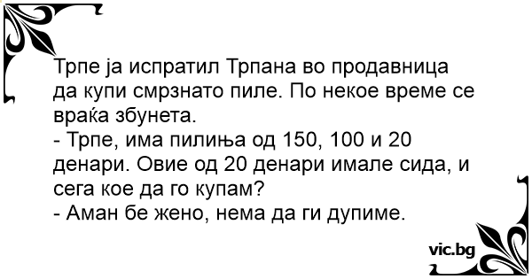 Трпе ја испратил Трпана во продавница да купи смрзнато пиле. По некое време се враќа збунета.