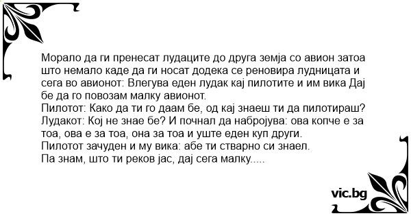 Морало да ги пренесат лудаците до друга земја со авион затоа што немало каде да ги носат додека се реновира лудницата и сега во авионот: Влегува еден лудак кај пилотите и им вика Дај бе да го повозам малку авионот.