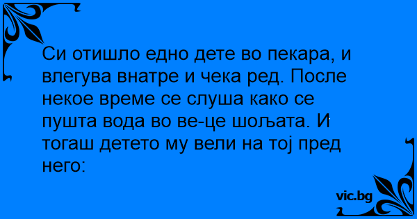 Си отишло едно дете во пекара, и влегува внатре и чека ред. После некое време се слуша како се пушта вода во ве-це шољата. И тогаш детето му вели на тој пред него:
