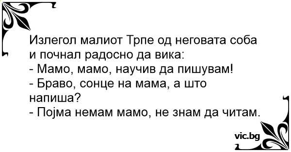 A kisfiút az édesanyja az iskola kapujában várja az első tanítási nap után. - Na, mit tanultatok ma? - kérdi tőle. - Képzeld, megtanultam írni! - feleli a kisfiú büszkén. - Igen? Egyetlen nap...