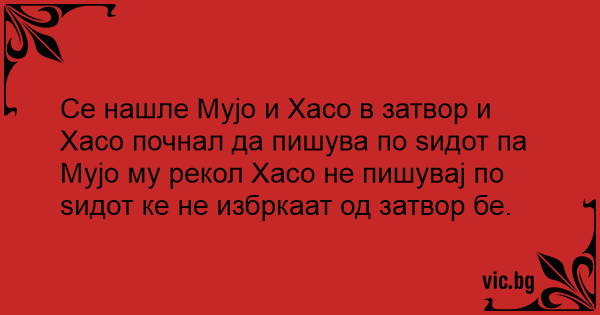 Се нашле Мујо и Хасо в затвор и Хасо почнал да пишува по ѕидот па Мујо му рекол Хасо не пишувај по ѕидот ке не избркаат од затвор бе.