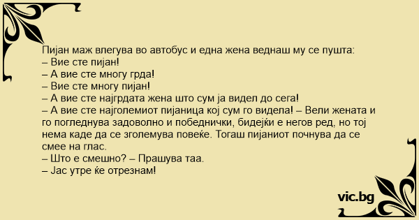 – А вие сте најголемиот пијаница кој сум го видела! – Вели жената и го погледнува задоволно и победнички, бидејќи е негов ред, но тој нема каде да се зголемува повеќе. Тогаш пијаниот почнува да се смее на глас.
