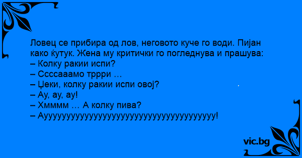 Ловец се прибира од лов, неговото куче го води. Пијан како ќутук. Жена му критички го погледнува и прашува: