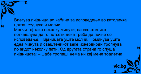 Молчи тој така неколку минути, па свештеникот поткашлува да го потсети дека треба да почне со исповедање. Пијаницата уште молчи. Поминува уште една минута и свештеникот веќе изнервиран тропнува по ѕидот неколку пати. Од другата страна го слуша пијаницата: – Џабе тропаш, нема ни кај мене тоалетна.