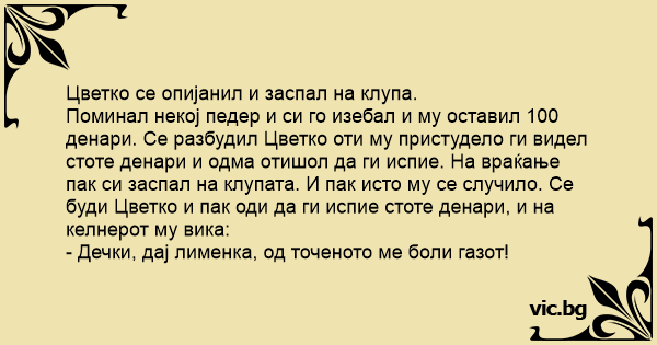 Поминал некој педер и си го изебал и му оставил 100 денари. Се разбудил Цветко оти му пристудело ги видел стоте денари и одма отишол да ги испие. На враќање пак си заспал на клупата. И пак исто му се случило. Се буди Цветко и пак оди да ги испие стоте денари, и на келнерот му вика: