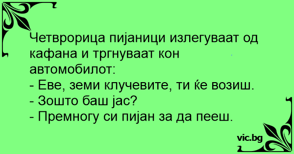 Четврорица пијаници излегуваат од кафана и тргнуваат кон автомобилот: