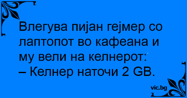 Влегува пијан гејмер со лаптопот во кафеана и му вели на келнерот: