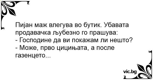 Пијан маж влегува во бутик. Убавата продавачка љубезно го прашува: